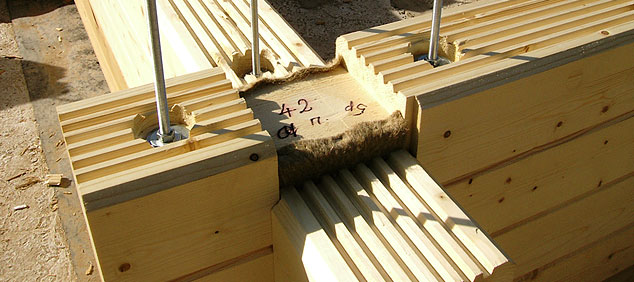 Пазы и гребни венцов в процессе монтажа соединяются друг с другом «с натягом», обеспечивая герметичность стен. Благодаря этому не требуется укладка утеплителя между венцами, утепляются только угловые замковые соединения.