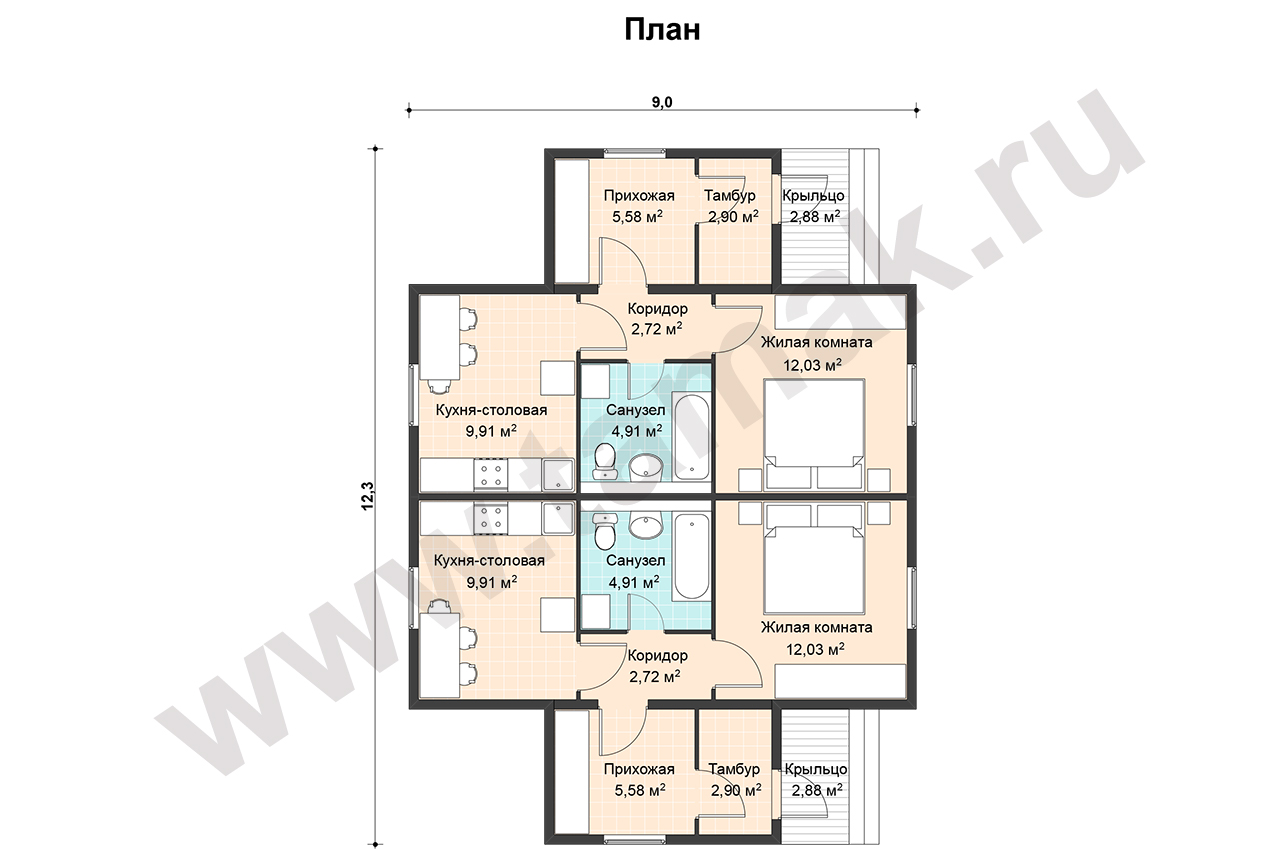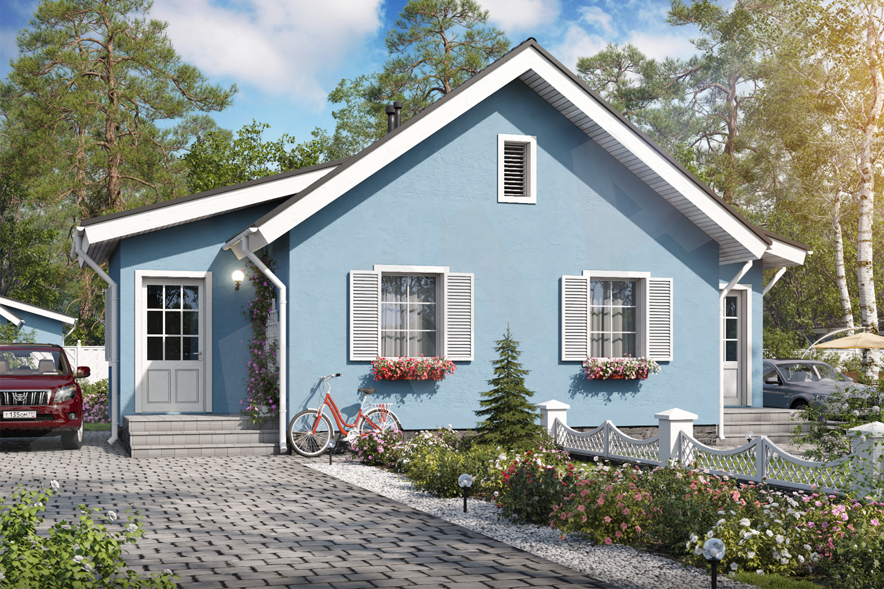 Данный проект - это дуплекс: два небольших автономных независимых дома. Каждый отдельный дом имеет площадь 40,9 м2 и предназначен для проживания 1-2 человек. Идеальное решение для молодой семьи, которая хочет жить рядом с родителями, но автономно от них.