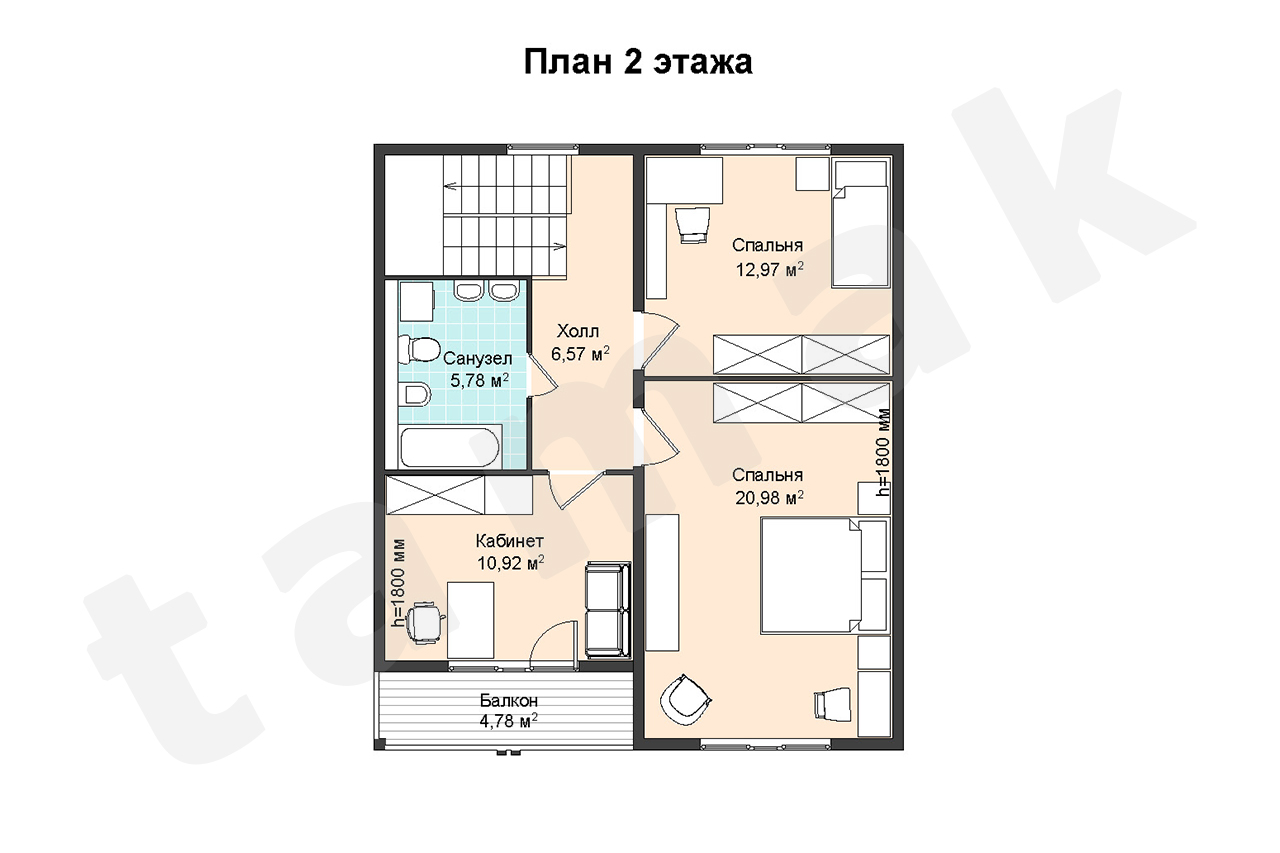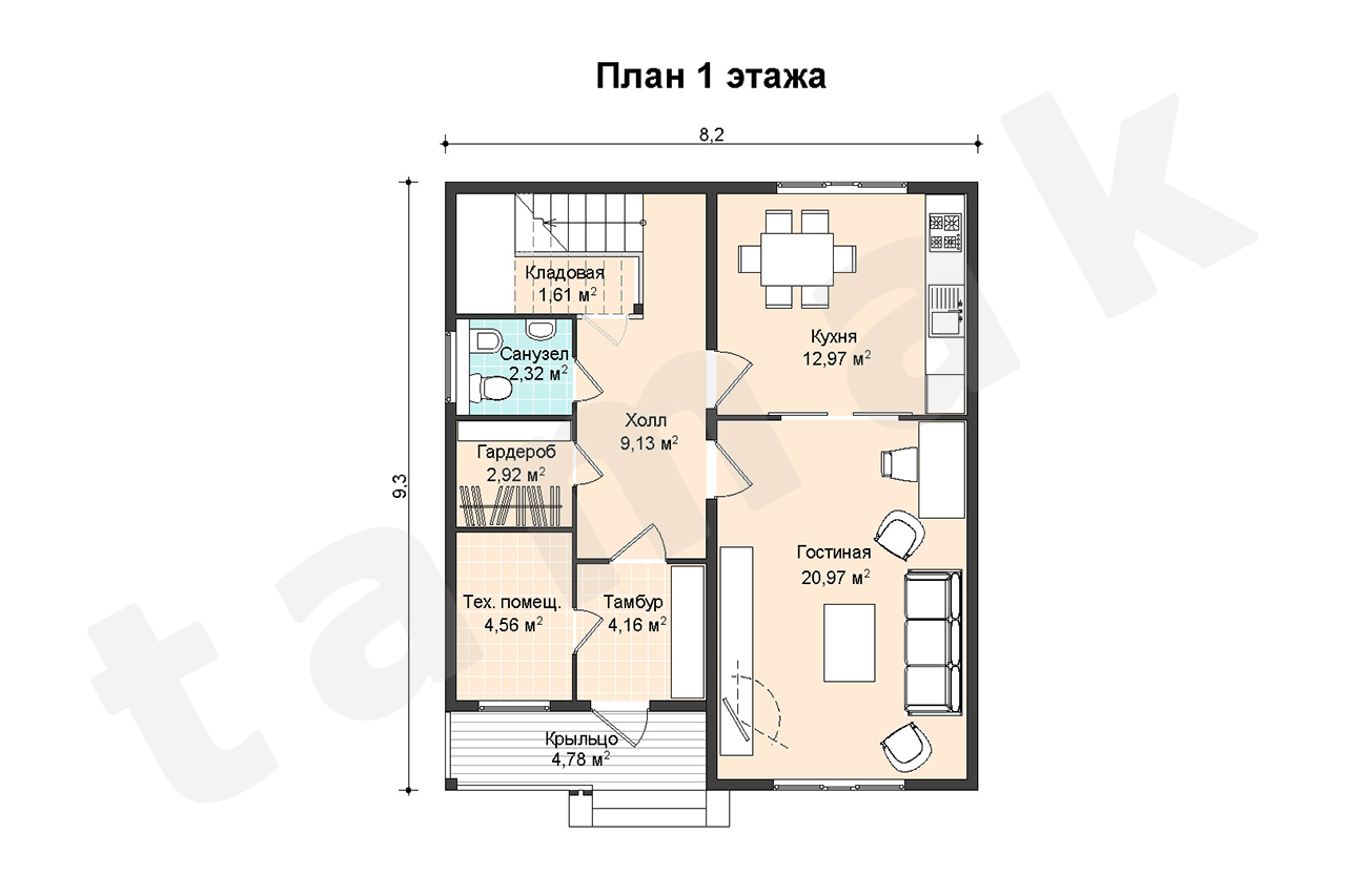 Планировка дома продумана до мелочей. На первом этаже размещается гостиная, кухня, гардеробная комната, санузел, холл, техническое помещение, тамбур. Кухня и гостиная являются отдельными помещениями, но соединяются порталом с раздвижными дверями, который при желании объединяет оба помещения модифицируя первый этаж в студию. Все пространство под лестницей используется в качестве кладовой практично используя каждый квадратный метр. На втором этаже расположились две спальни, кабинет, который имеет выход на уютный балкон, большой санузел и холл.