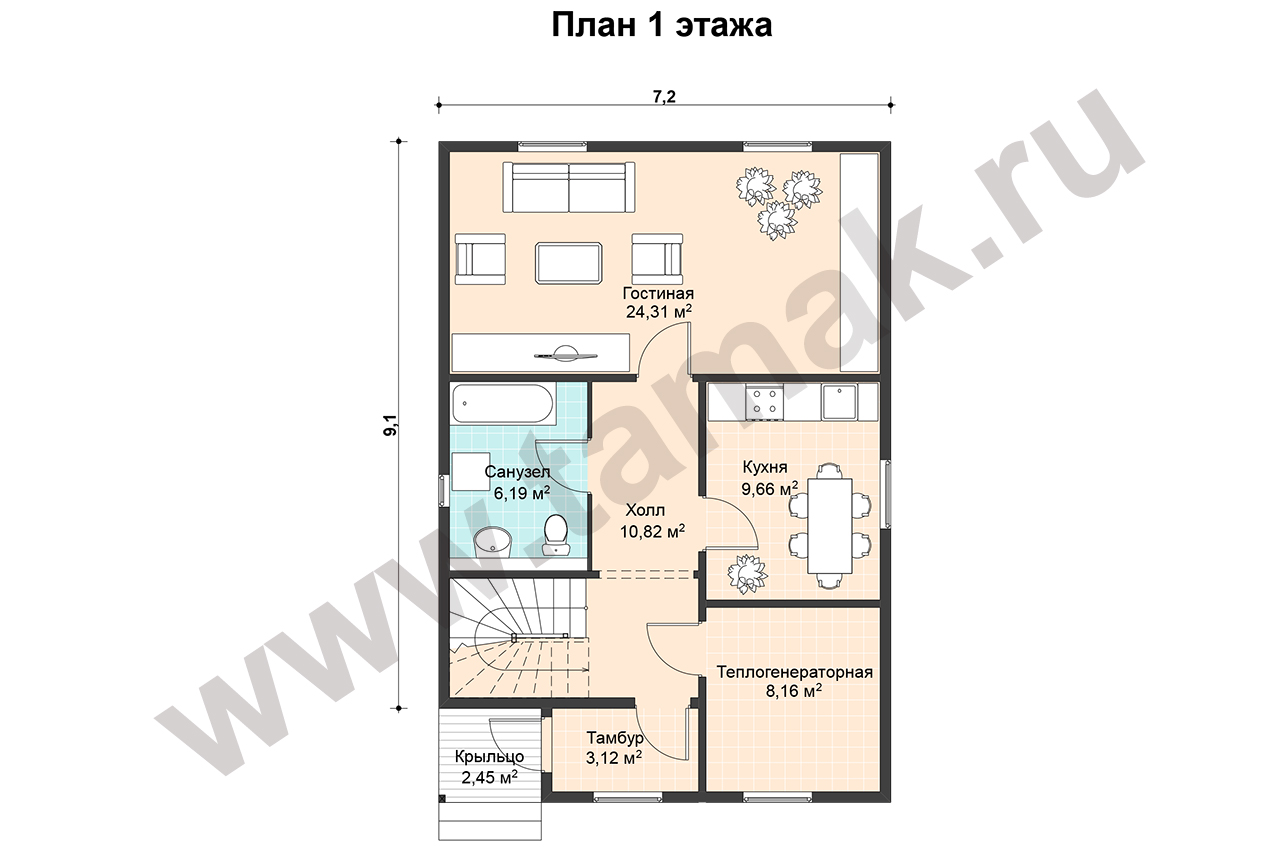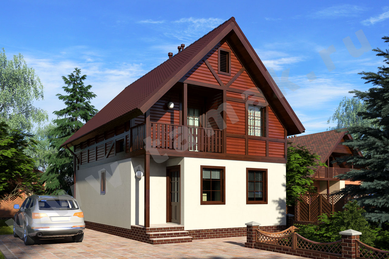 Проект выполнен в стиле шале. Строение альпийского типа смотрится оригинально и живописно: фасады первого этажа отделаны штукатуркой, а второго - деревом. Подобный стиль имеет широкое распространение в Европе. На первом этаже в гостевой части дома расположены просторная гостиная, кухня, санузел, большая теплогенераторная и тамбур. Хозяйская часть дома содержит три спальни, гардеробную, балкон, санузел, а главное, удобную кладовую. Изюминкой проекта являются две большие ванные комнаты, одна из которых имеет окно, позволяющее любоваться видом из окна во время наслаждения водными процедурамии.