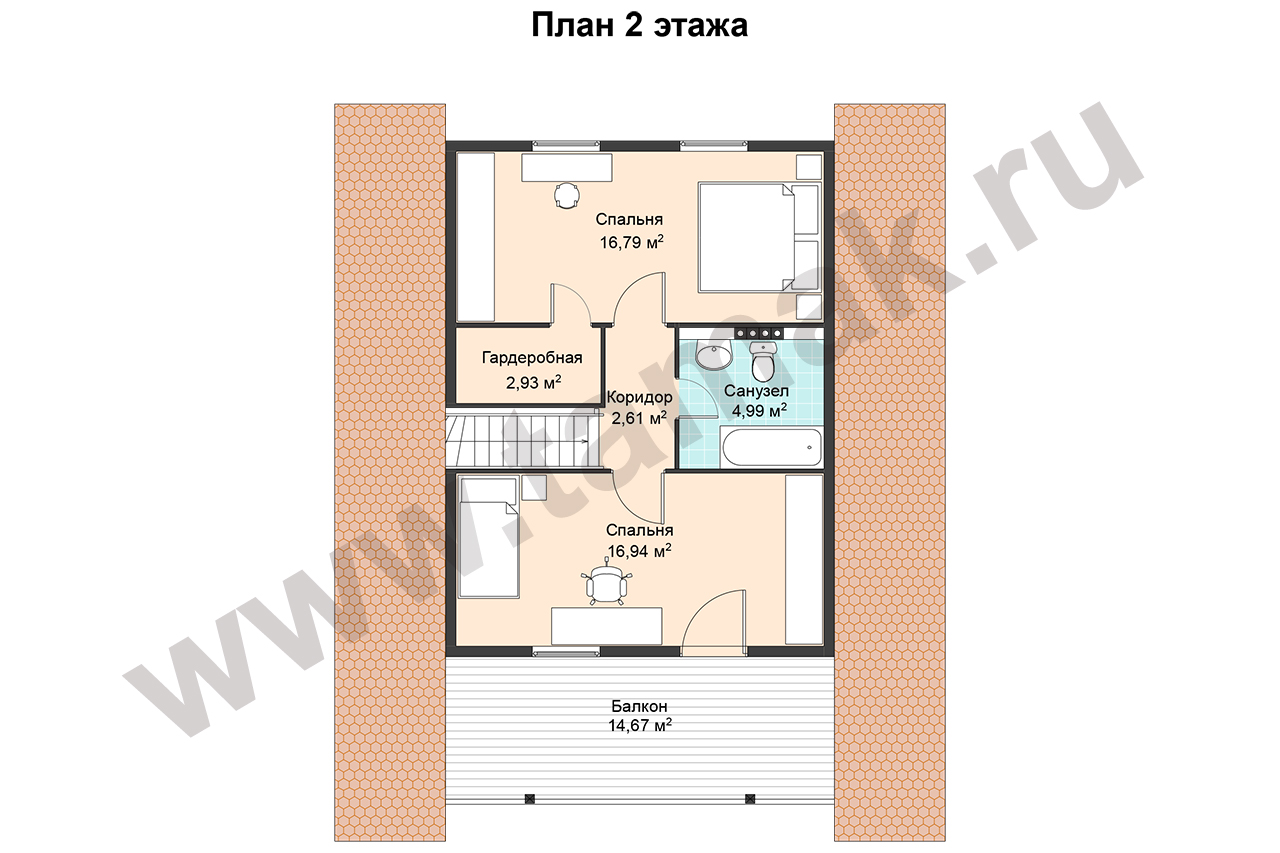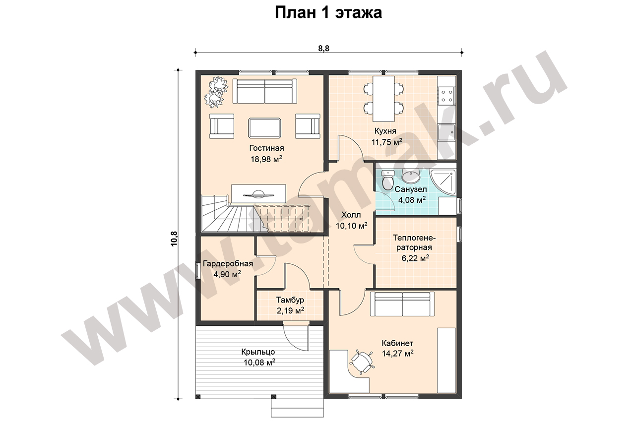 Элегантная простота – самое верное определение данного проекта. Максимально комфортный и продуманный проект. В этом доме у каждой вещи будет собственное место, так как в планировке учтены наличие тамбура, теплогенераторной, двух санузлов и гардеробной комнаты на каждом этаже. Жильцы также могут реализовать любые свои желания. Большая гостиная и отдельная просторная кухня прекрасно подойдут для дружеской вечеринки, а отдельный уединенный кабинет позволит поработать в тишине и спокойствии . Второй этаж – независимое личное пространство хозяев: две большие спальни, отдельная ванная с санузлом, гардеробная, и изюминка проекта – большой, но очень камерный балкон с уютной атмосферой, на котором можно уединиться и расслабиться. И еще один плюс проекта – это большие окна, которые наполняют дом естественным освещением.